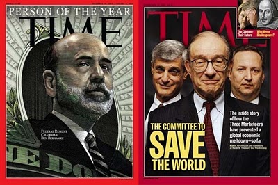 In reality Bernanke problem (in a slightly hyperbolized way) can be classified along the line of the psychological phenomenon called "brainwashing", "indoctrination" or, even "beliefs induced idiocy" ( see, for example, discussion of malicious animal magnetism in The psychology of conviction: a study of beliefs and attitudes). Despite his high IQ he behaved and still behaves more like a brainwashed lemming moving with the crowd off the cliff, then as an independent thinker, capable of challenging the establishment view and critisize the detached from the reality economic orthodoxy. He is just one of Wall Street financialization apparatchiks. A regular member of financial Politburo. Much like Greenspan, Rubin and Summers, financial apparatchiks troika which graced Time cover some time before Dr. Bernanke. Much like members of Politburo graced Soviet magazines.