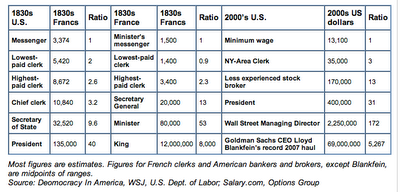 The Wall Street Journal Economics Blog today featured an update of a chart prepared by Alexis de Tocqueville, author of Democracy in America, comparing the compensation of French and American civil servants, with an update (click to enlarge):