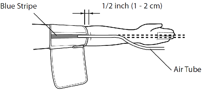 - Put your left arm through the cuff loop. The bottom of the cuff should be about 1 – 2 cm above your elbow (thickness of your index or middle finger). Adjust the cuff around your arm so that the tubing runs down the centre of your arm in line with your middle finger (palm open and facing upwards).
